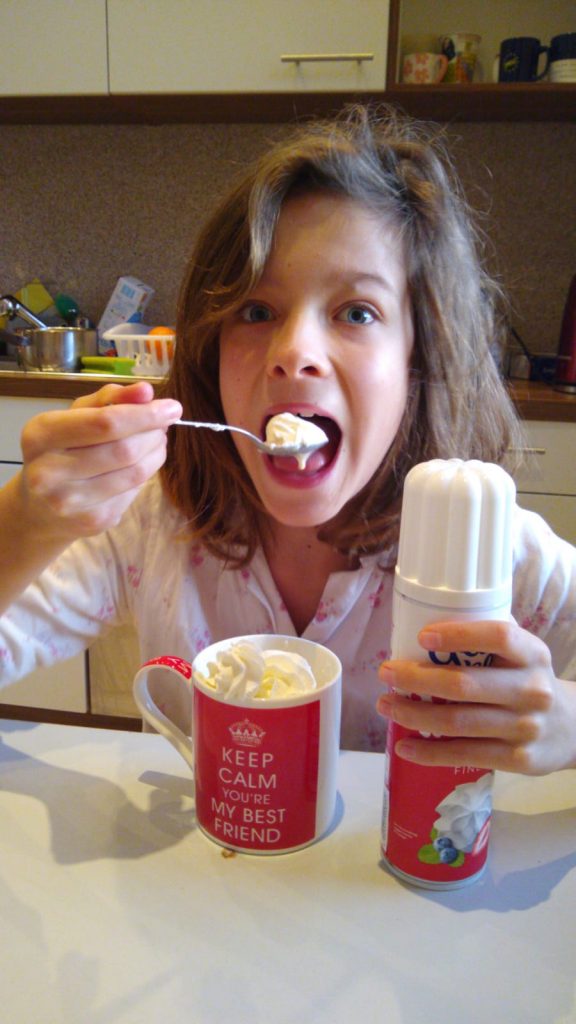 I had bought one of those aerosol-container whipped creams, and now Little is consuming it with her tea as well, because she really does not want it to “go off”.